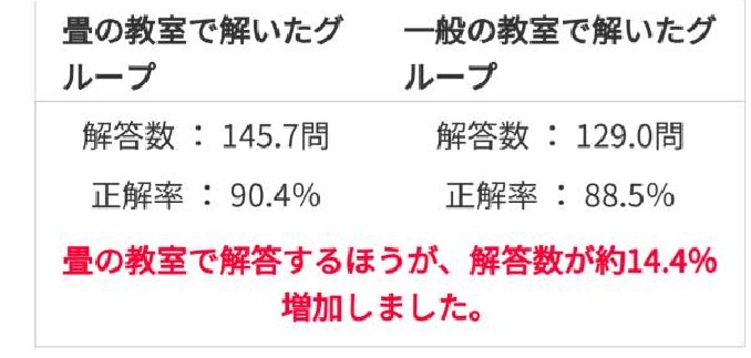 中学生、小学生に畳の部屋と一般の部屋に分かれて試験を受けてもらったところこのような結果になりました。